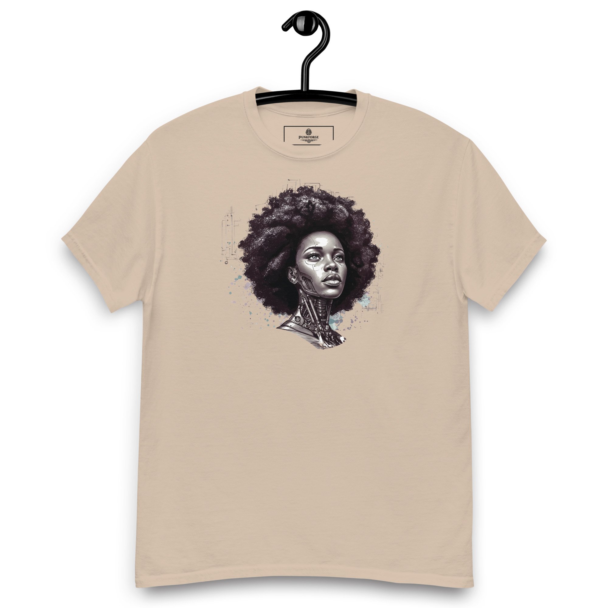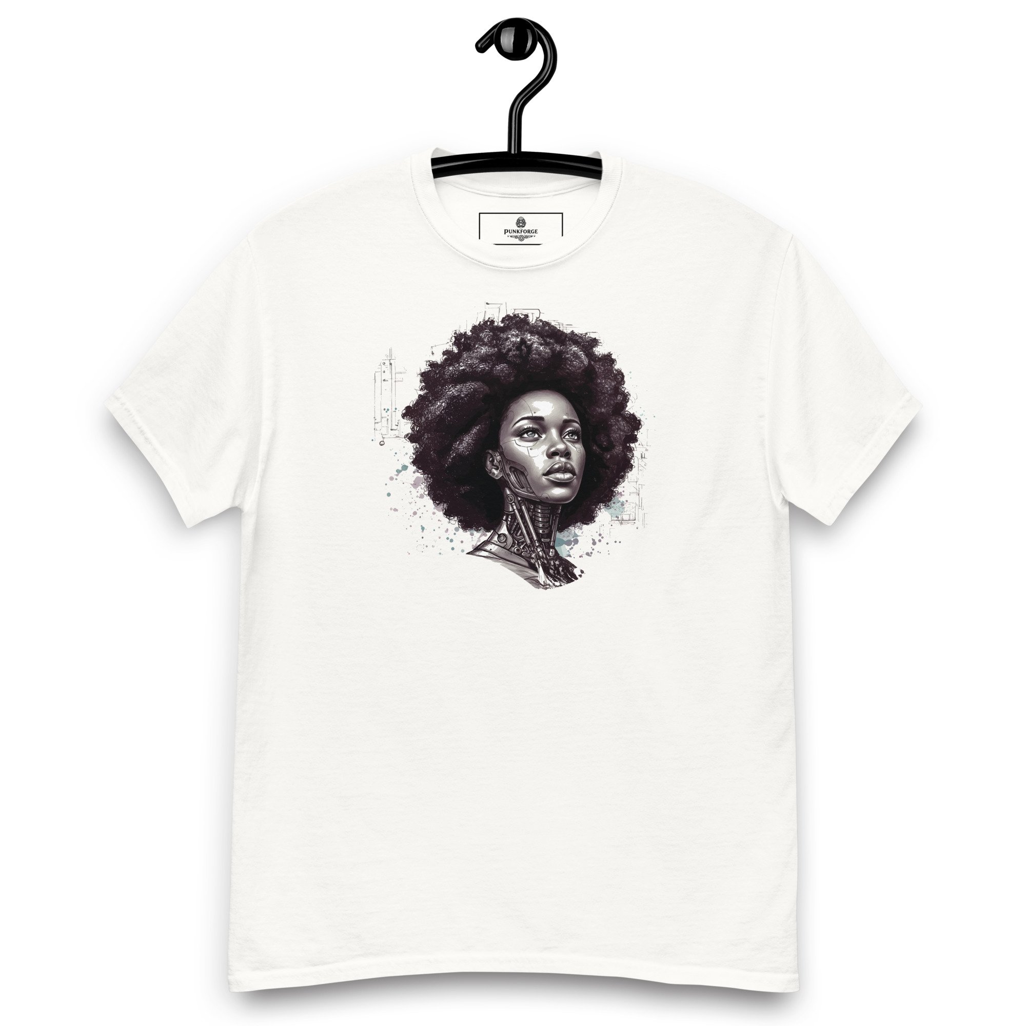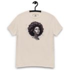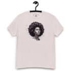 Le t-shirt classique unisexe 100 % coton vous aidera à obtenir un look plus structuré. Sa jolie coupe et ses lignes nettes sur les bords en font un vêtement facile à assortir avec les tenues streetwear superposées. De plus, il est extrêmement tendance maintenant ! Ce t-shirt à col rond de couleur claire présente une illustration graphique raffinée d’un visage féminin. Les nuances de noir et gris du portrait sont rehaussées par des touches de bleu, offrant un design contemporain avec des détails stylisés, notamment une coiffure bouclée et des motifs décoratifs autour du cou. Le tissu offre une texture lisse, confortable et résistante.