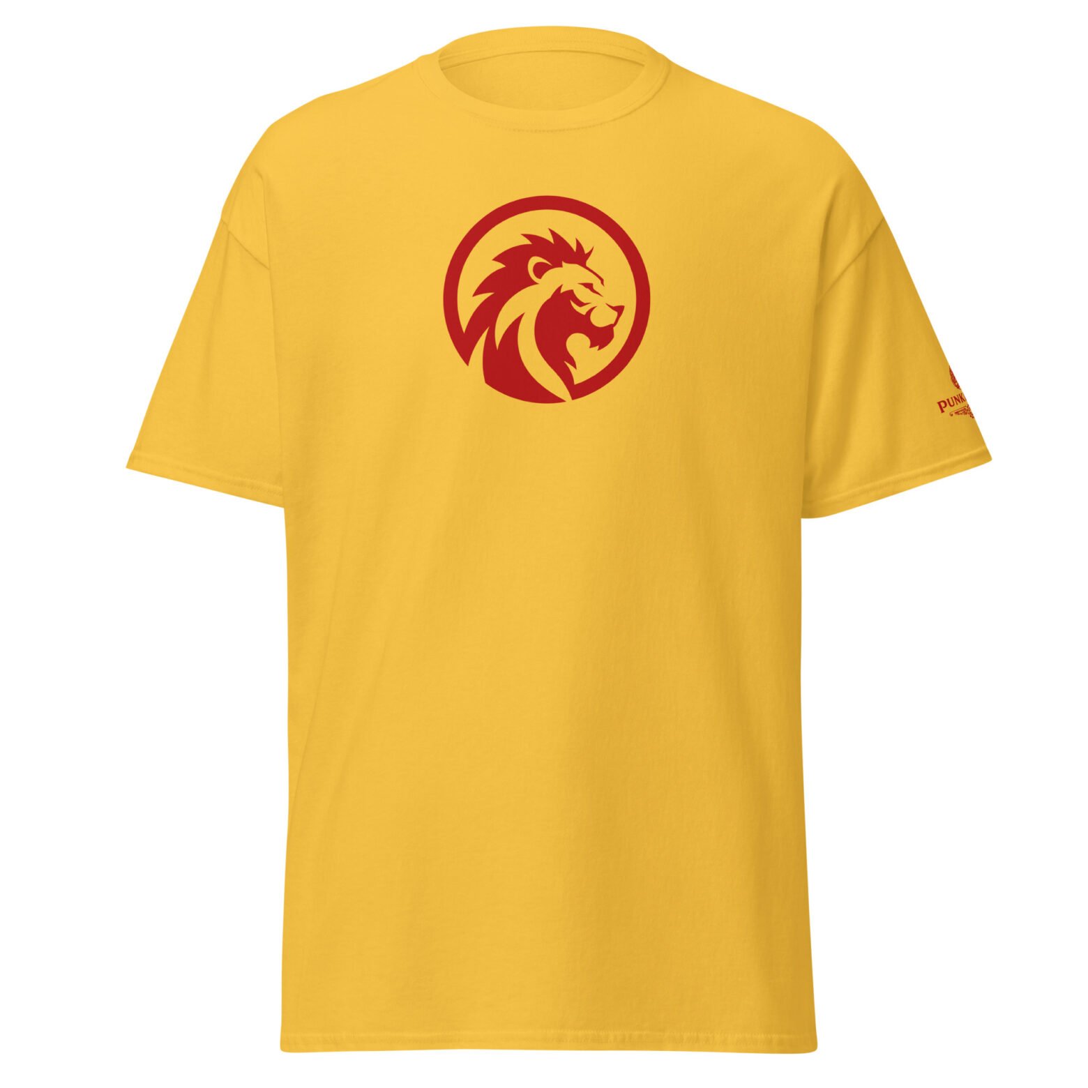 Le t-shirt classique unisexe 100 % coton vous aidera à obtenir un look plus structuré. Sa jolie coupe et ses lignes nettes sur les bords en font un vêtement facile à assortir avec les tenues streetwear superposées. Ce modèle présente une couleur jaune vif agrémentée d’un logo rouge représentant un lion au centre, sur un tissu lisse et moderne, idéal pour un style minimaliste.