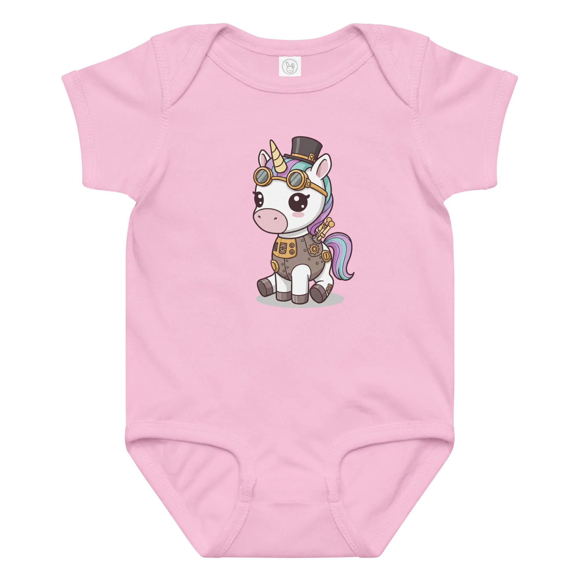 Le body est orné d’un design original de licorne cartoon à corps blanc, crinière multicolore et corne dorée. La licorne porte un haut-de-forme et des lunettes, intégrés dans un costume steampunk avec engrenages et tubes. Ce body à manches courtes présente un col rond et des boutons-pression à l’entrejambe pour un habillage simplifié.
