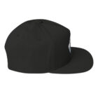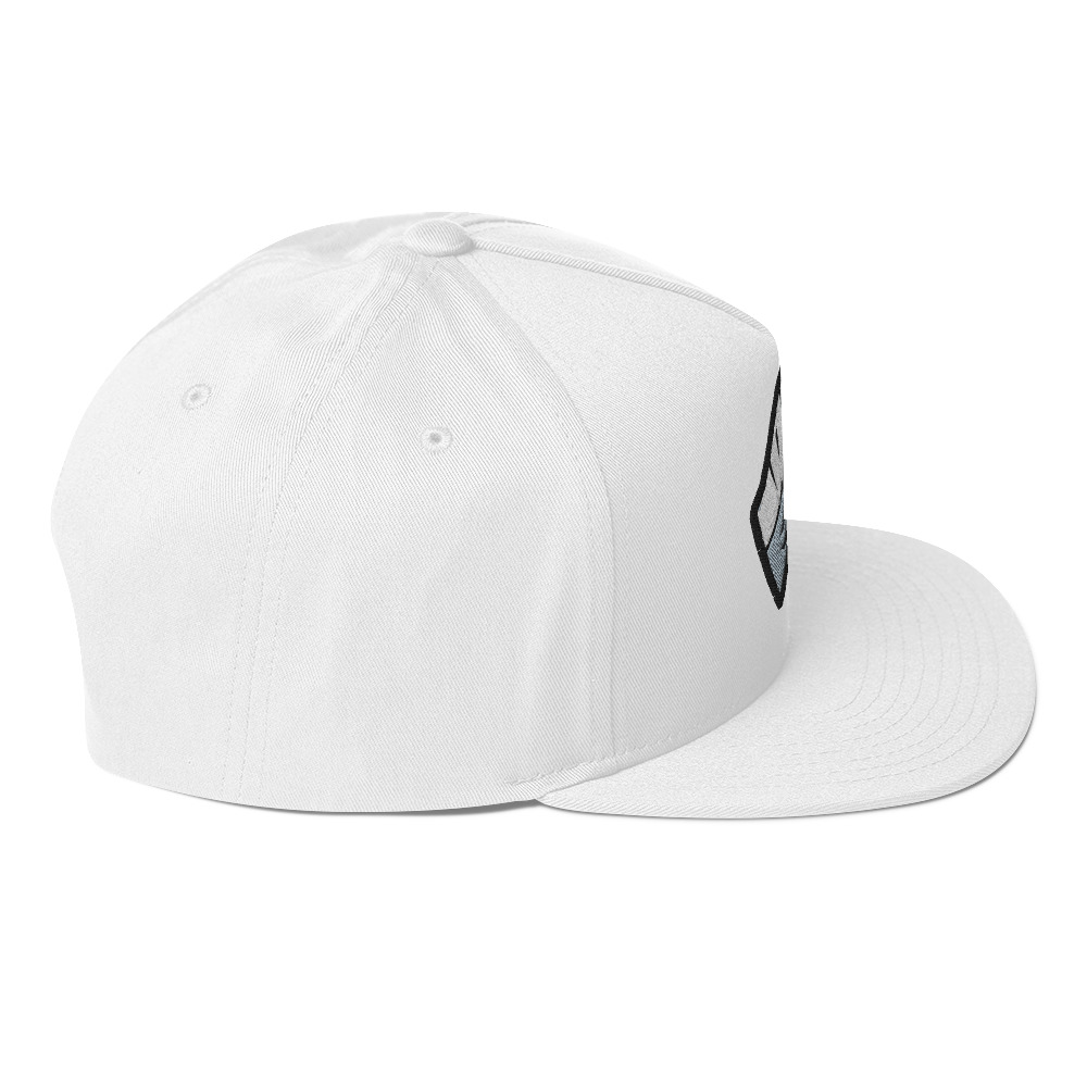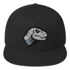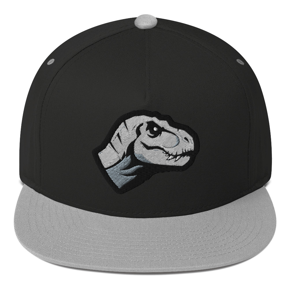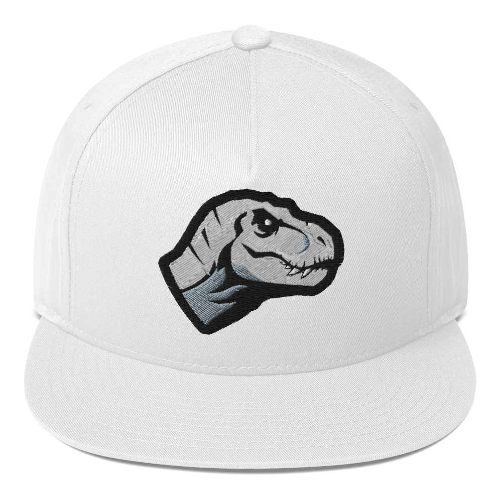 Casquette structurée avec visière plate et bouton supérieur, principalement blanche. Motif brodé sur le devant montrant une tête de dinosaure stylisée en noir, gris et blanc. Fabriquée en tissu avec texture visible en fil, coutures apparentes. Visière rigide, aucune pièce mobile ni accessoire visible. • Sergé 100 % coton