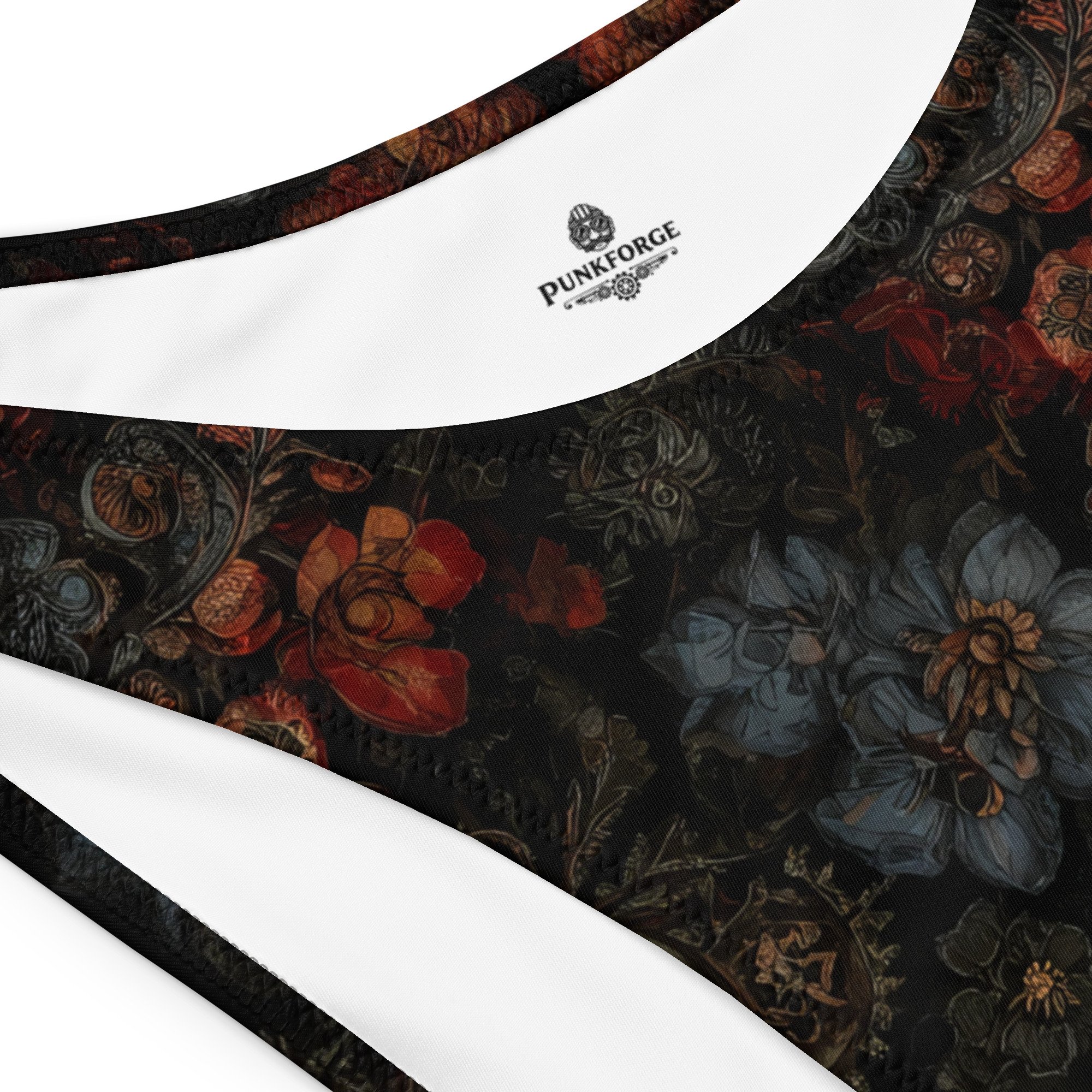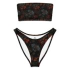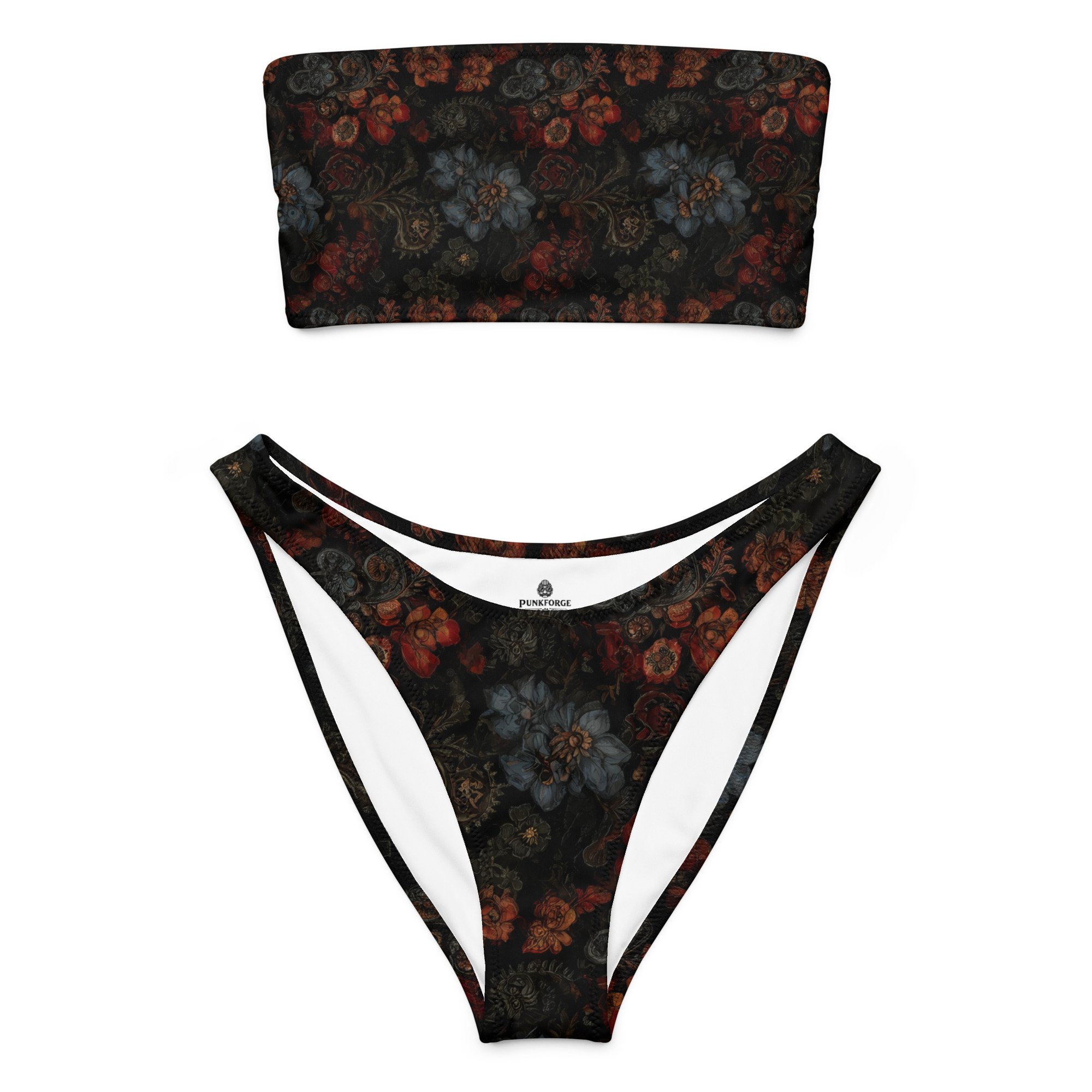 Le maillot de bain bandeau deux pièces comprend un haut bandeau sans bretelles et un bas de bikini à coupe en V avec échancrure haute. Les deux pièces affichent un motif floral sombre marqué par des nuances noires, rouges et vert turquoise atténué. Le tissu lisse présente un motif floral fin et complexe, créant un look vintage élégant. Conçu pour les journées à la plage, les moments à la piscine et les bains de soleil. Ce maillot de bain bandeau est doux, extensible et flatteur. Conçu pour le mouvement, le farniente et tout le reste.