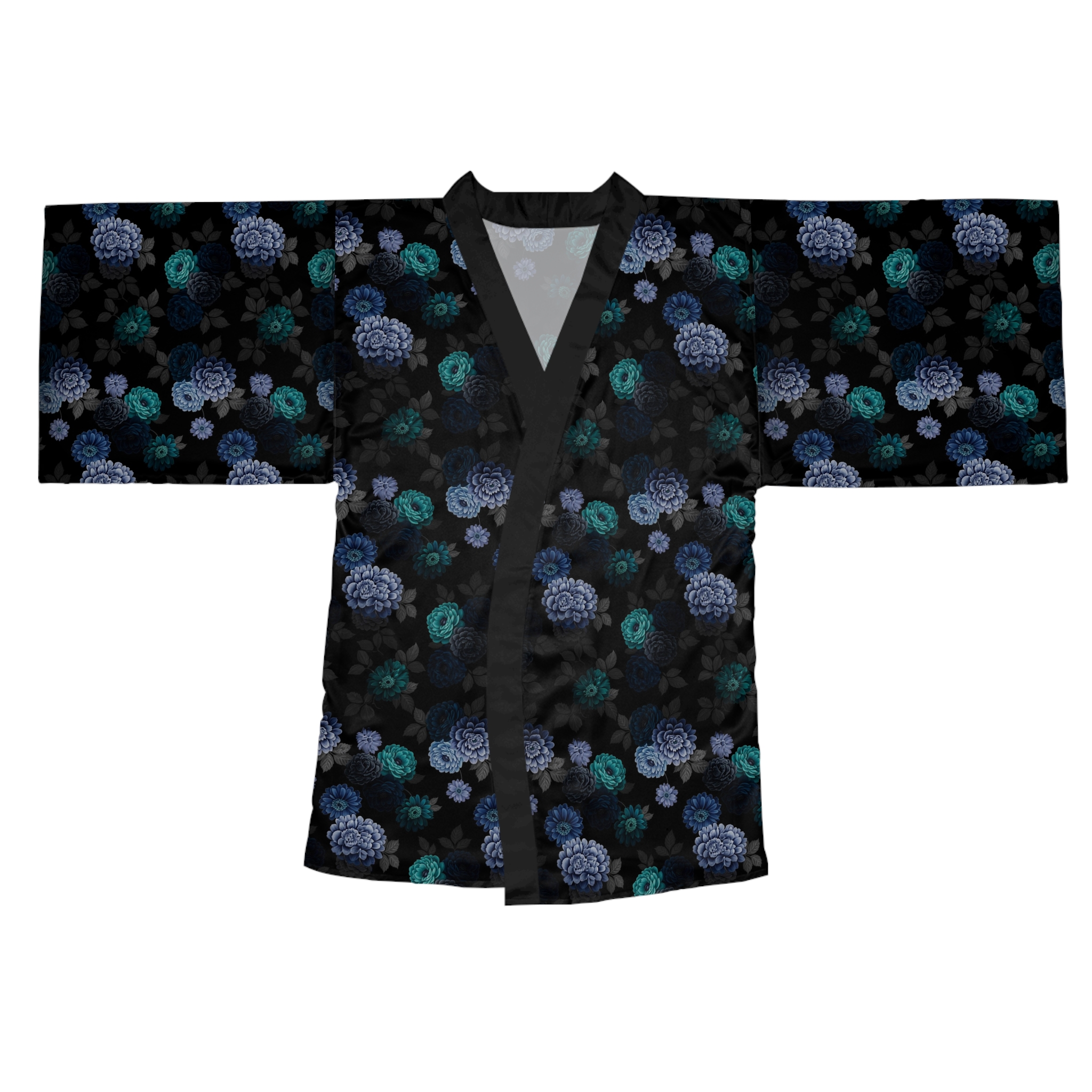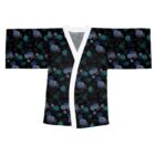 Float into evening with this lightweight kimono robe, where midnight florals bloom across a satin-smooth backdrop. The mid-length cut and flowing bell sleeves create graceful movement whether you’re slipping into quiet morning rituals or stepping out for a low-key gathering. The silhouette flatters while the soft, quick-drying polyester keeps the drape crisp and comfortable. Contrasting front trim and a simple belt anchor the look in classic lines — wear it loose at home or belt it for nights when you want to feel both dressed and effortless. The muted teal and indigo blossoms against deep black bring a moody, artful mood that settles like twilight around the shoulders.