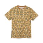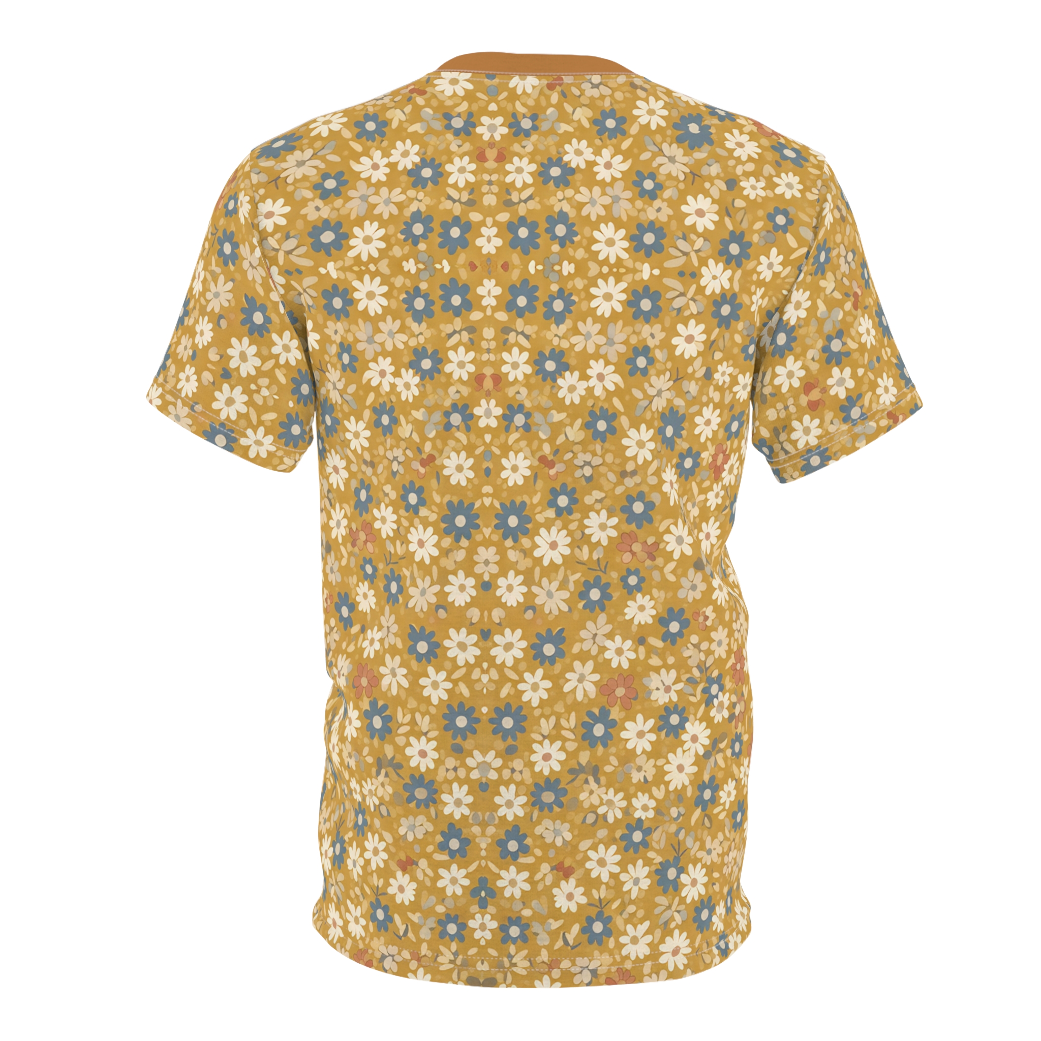 Warm, sunlit and quietly nostalgic — this all-over print tee brings a vintage floral tapestry into everyday wear. The fine mustard background and scattered small blooms in muted blues, creams, and terracotta create a gentle, lived-in look that pairs easily with worn denim, corduroy jackets, or layered under an open cardigan. Lightweight and breathable, it moves with you on strolls through farmers’ markets, afternoons at a porch café, or slow weekend drives where the playlist matters more than the destination. The ribbed collar and shoulder tape give subtle structure so the silhouette stays balanced, while the tagless finish keeps the back soft against your skin. It’s for people who collect small rituals — morning coffee in a favorite mug, handwritten notes, afternoons spent thrifting — and want clothing that feels like another cozy ritual.