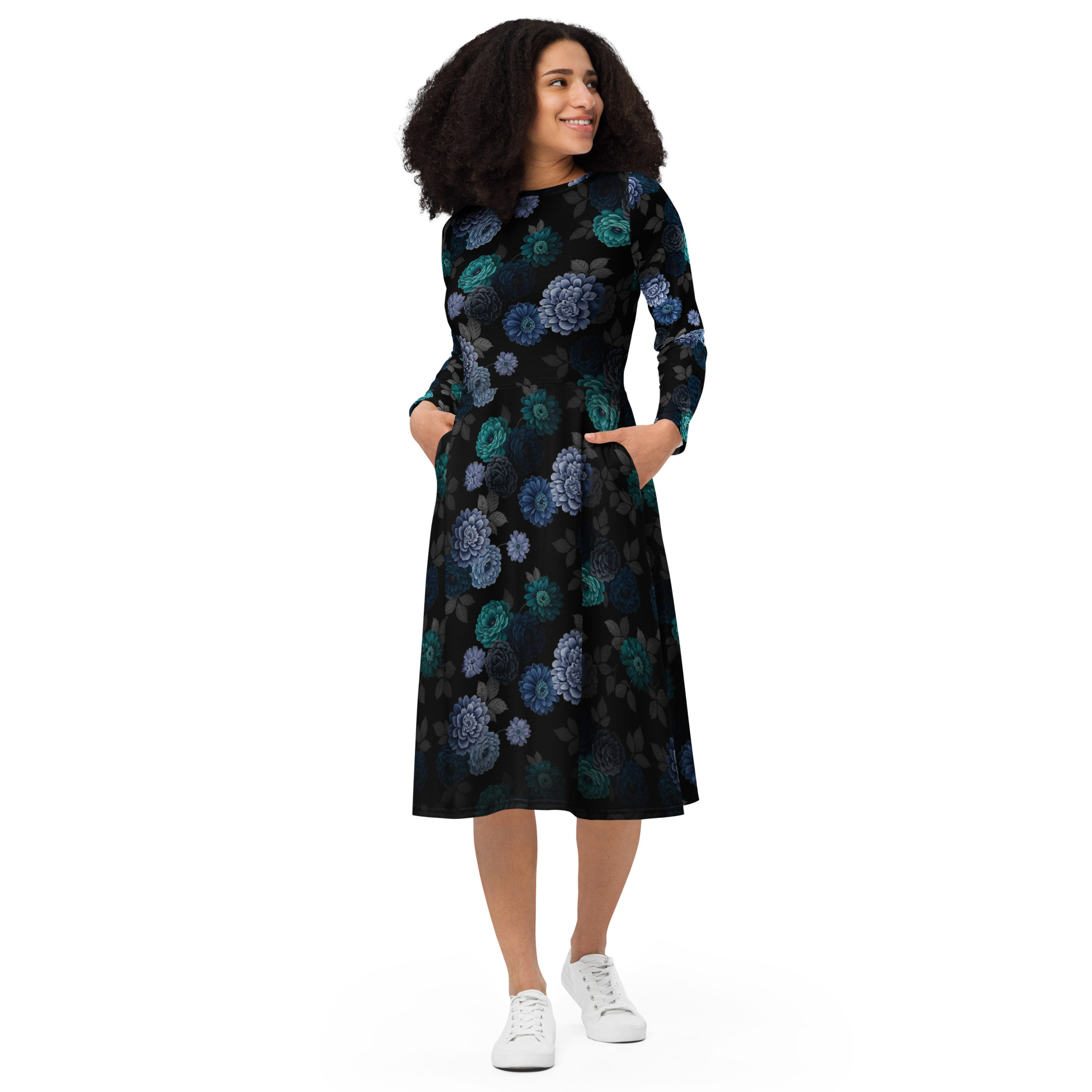 Voici votre nouvelle robe préférée. Cette robe florale gothique associe une élégance sombre à un confort absolu. Son imprimé floral profond, aux teintes bleutées et nocturnes sur fond noir, évoque une esthétique gothique raffinée et intemporelle.