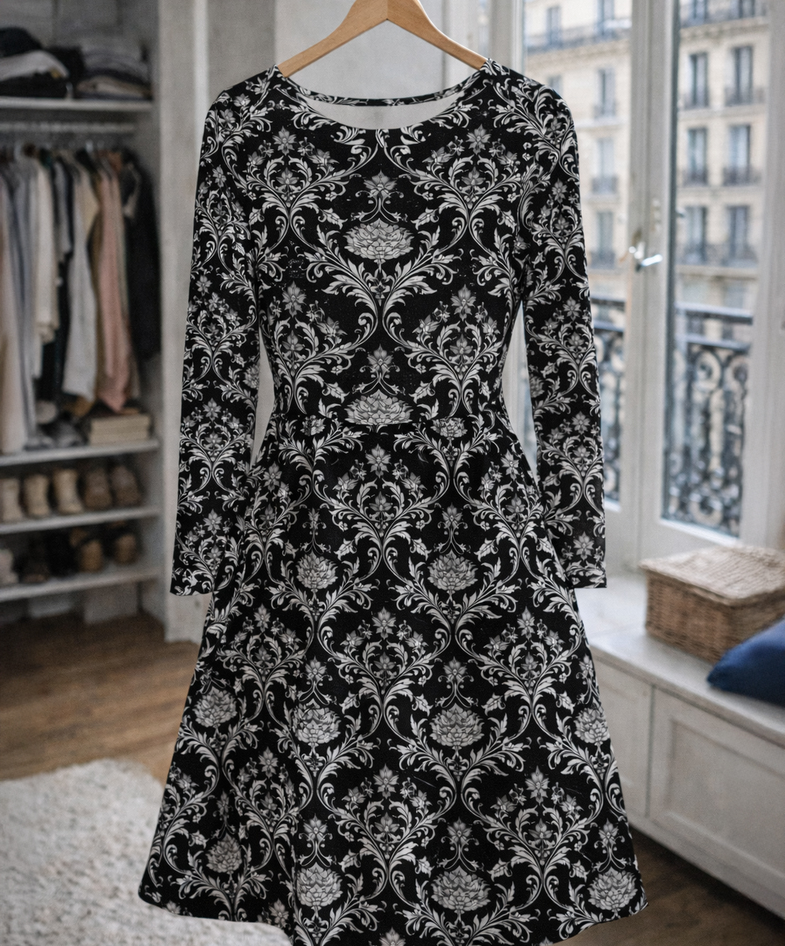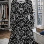 Belladonna est une robe qui semble sortie d’un ancien décor baroque, entre ombre gothique et élégance rétro. Son motif noir et argenté évoque les papiers peints des demeures anciennes, tout en restant étonnamment facile à porter au quotidien.