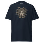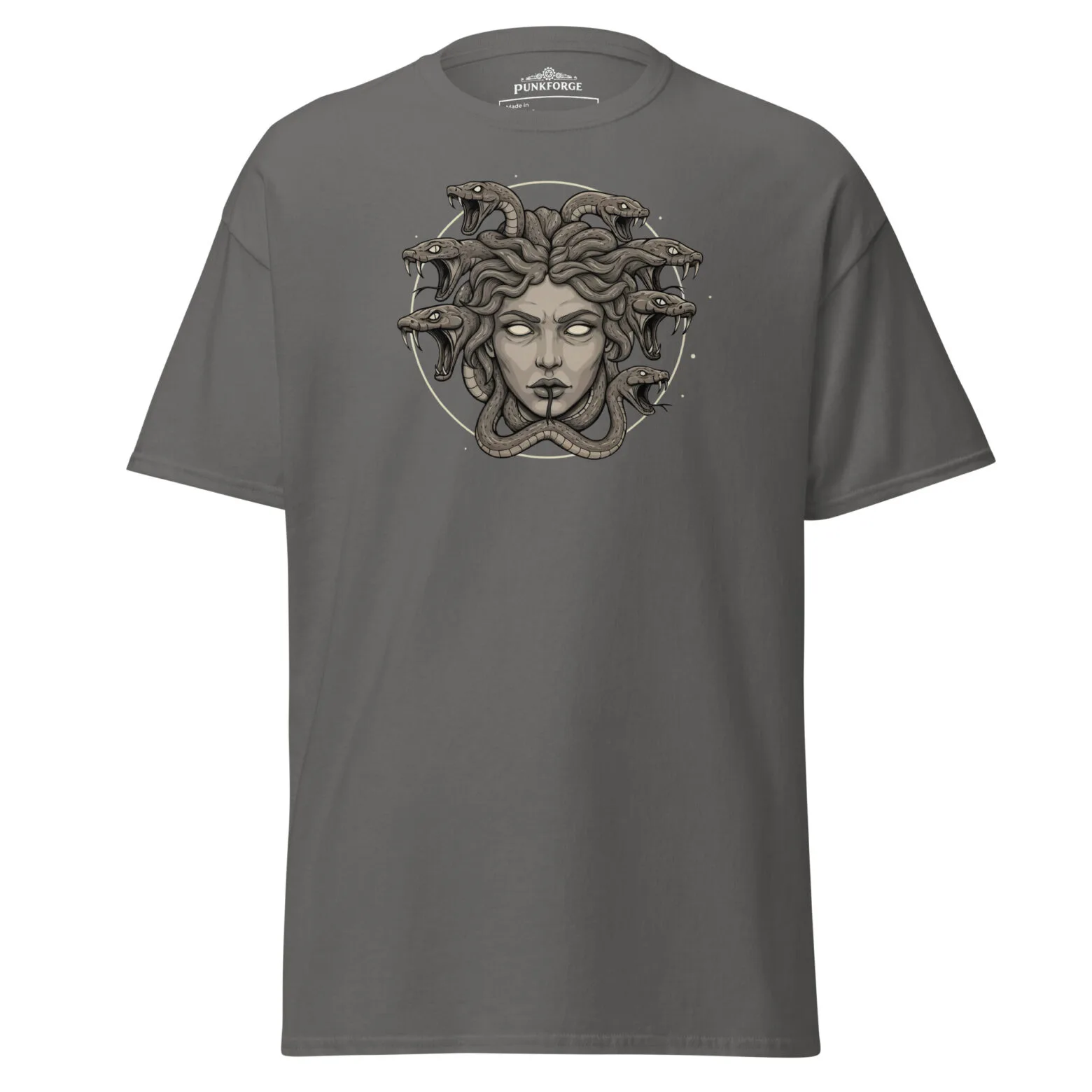 Le t-shirt classique unisexe 100 % coton vous aidera à obtenir un look plus structuré. Sa jolie coupe et ses lignes nettes sur les bords en font un vêtement facile à assortir avec les tenues streetwear superposées. De plus, il est extrêmement tendance maintenant ! Ce modèle présente un t-shirt à manches courtes de coupe classique, de couleur gris foncé avec une illustration centrale d’un visage féminin entouré de serpents, en nuances de beige et marron. Le tissu en coton offre une texture lisse, tandis que l’encolure ronde assure un confort optimal. • 100 % coton • Le gris sport est composé de 90 % de coton et de 10 % de polyester • Le gris cendré est composé de 99 % de coton et de 1 % de polyester • Les couleurs chinées sont 50 % de coton et 50 % de polyester • Poids du tissu : 170-180 g/m² (5,0-5,3 oz/yd²) • Fil ouvert • Tissu tubulaire • Ruban au col et aux épaules • Double couture aux manches et à l’ourlet inférieur • Produit vierge provenant du Honduras, du Nicaragua, d’Haïti, de la République dominicaine, du Bangladesh, du Mexique Avertissements : • En raison des propriétés du tissu, la variante de couleur blanche peut apparaître blanc cassé plutôt que blanc vif. • Des taches de couleur foncée peuvent être observées pour la couleur Natural.