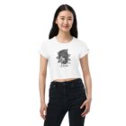 T-shirt blanc à manches courtes avec une encolure ronde. Impression centrale en noir d’un dessin représentant une femme au style cybernétique, avec des engrenages et des dispositifs mécaniques sur la tête, accompagnée du texte « Eliza » en dessous. Le tissu paraît lisse et uniforme, sans autres détails décoratifs apparents.