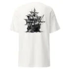 Le t-shirt classique unisexe 100 % coton vous aidera à obtenir un look plus structuré. Sa jolie coupe et ses lignes nettes sur les bords en font un vêtement facile à assortir avec les tenues streetwear superposées. Ce t-shirt blanc présente un motif de bateau pirate à l’arrière, illustrant un navire ancien avec plusieurs voiles, un crâne à la proue, et des détails noirs et bleus représentant l’eau, sur un tissu lisse et simple.