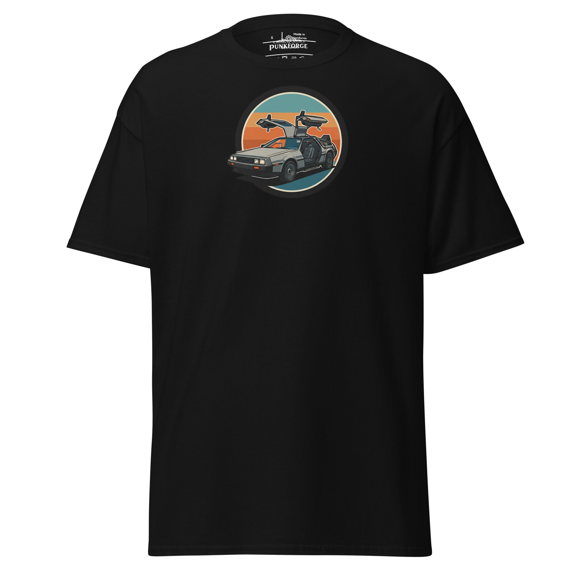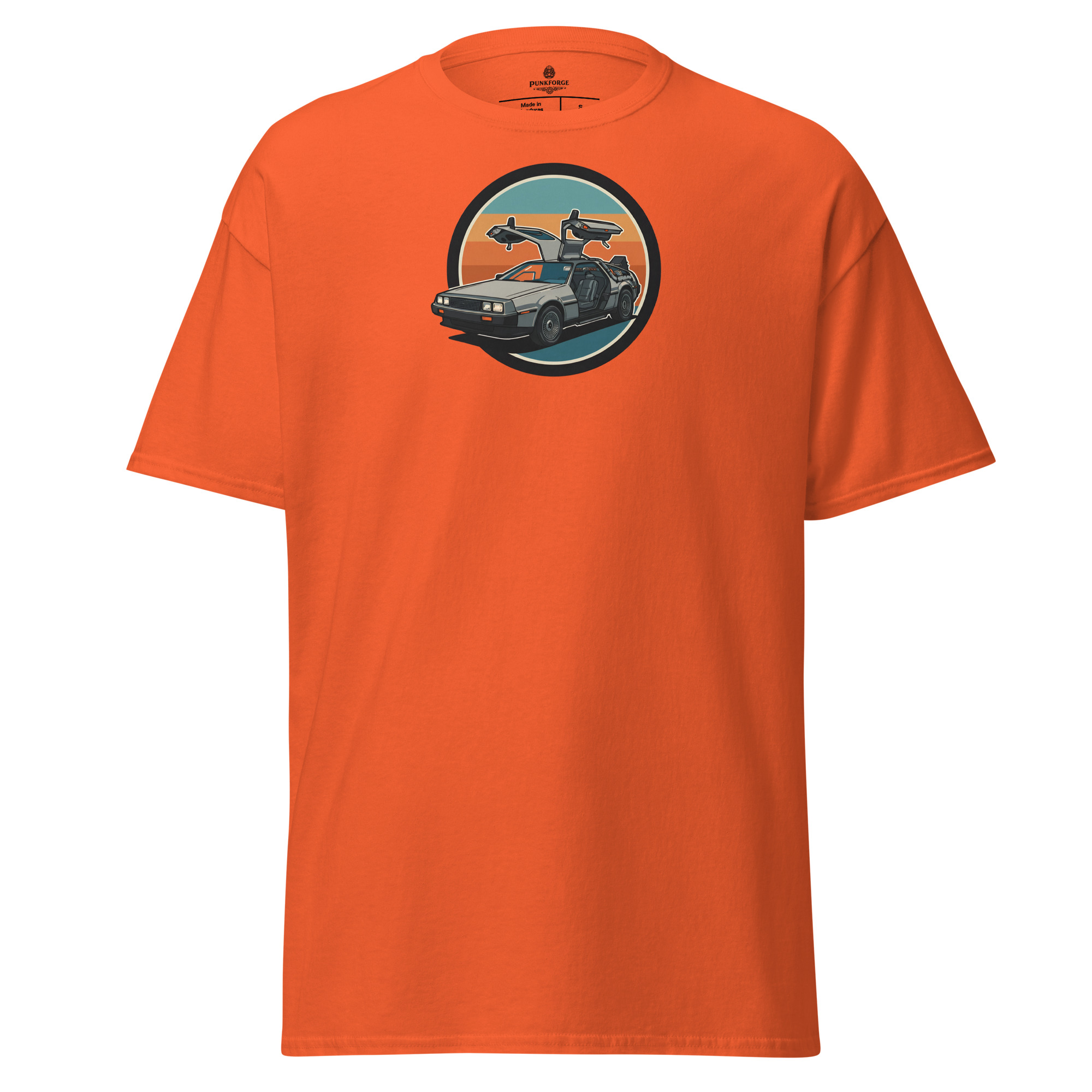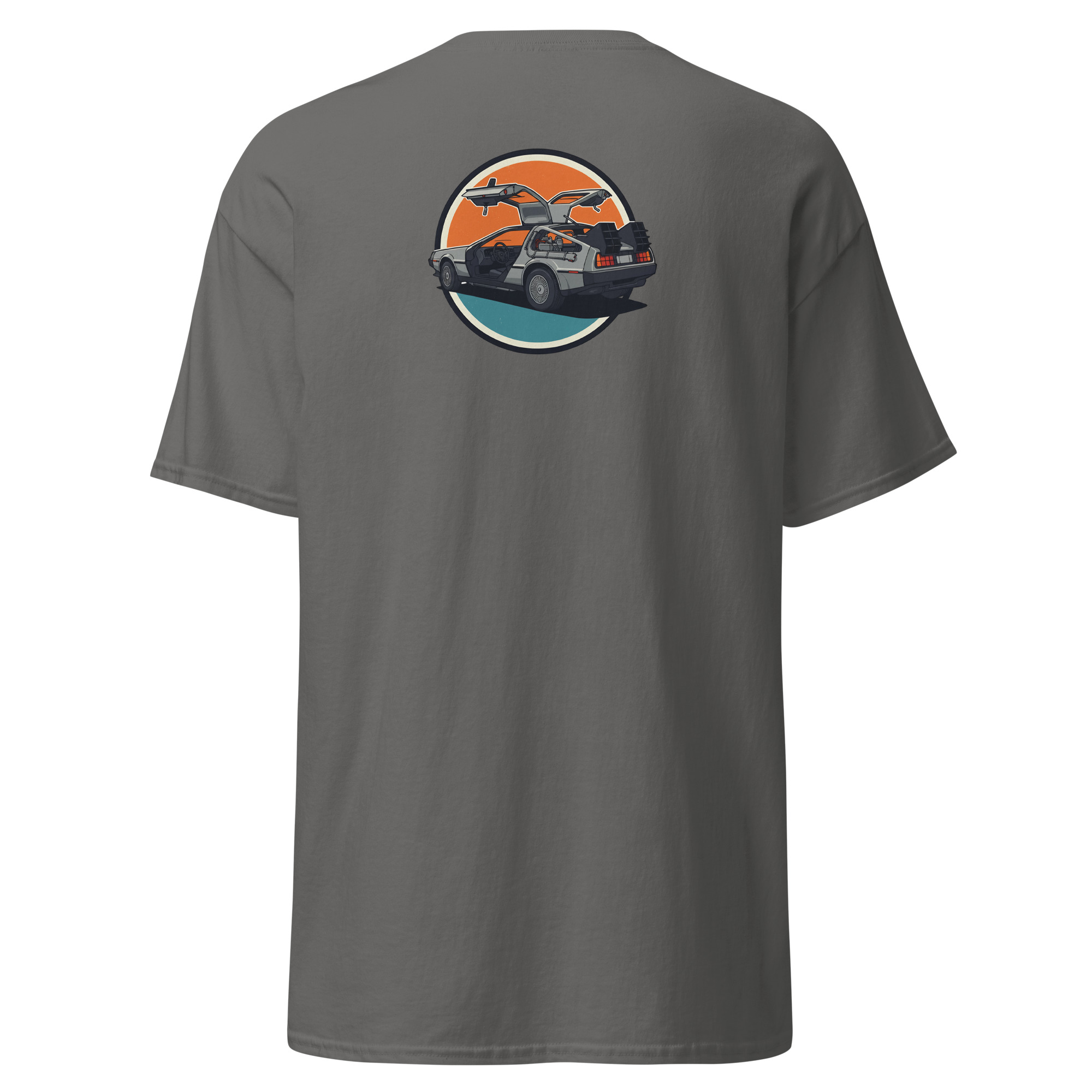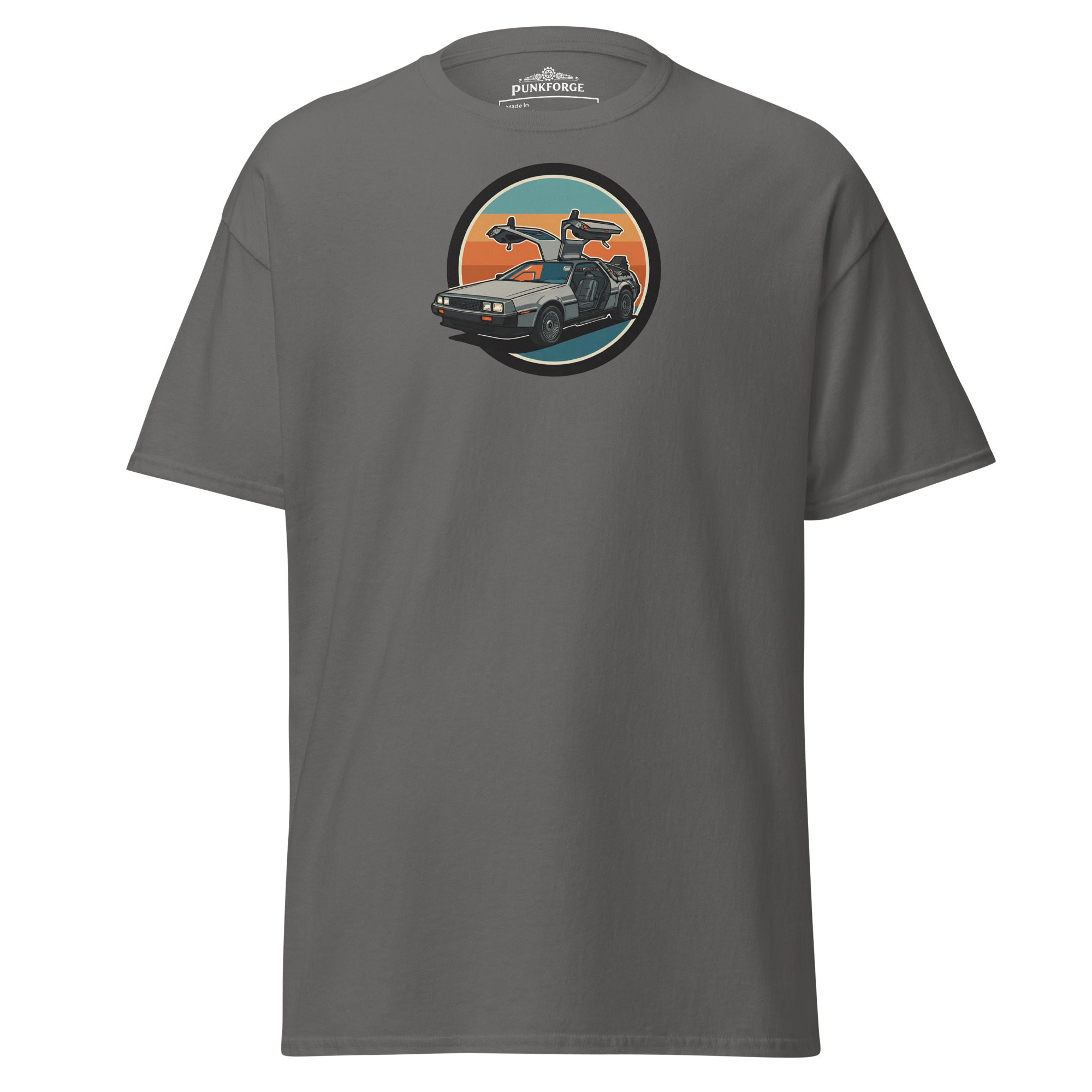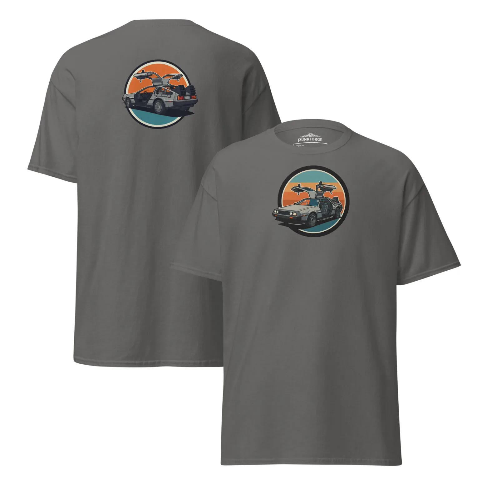 Le t-shirt classique unisexe 100 % coton vous aidera à obtenir un look plus structuré. Sa jolie coupe et ses lignes nettes sur les bords en font un vêtement facile à assortir avec les tenues streetwear superposées. De plus, il est extrêmement tendance maintenant ! Le t-shirt présente une forme classique avec des manches courtes et un col rond. Sa couleur dominante gris uni met en valeur un imprimé original représentant un véhicule aux portes en aile de mouette, posé sur un fond circulaire avec des dégradés orange et bleu. La surface en coton offre une texture lisse et agréable au toucher, parfaite pour un usage quotidien.