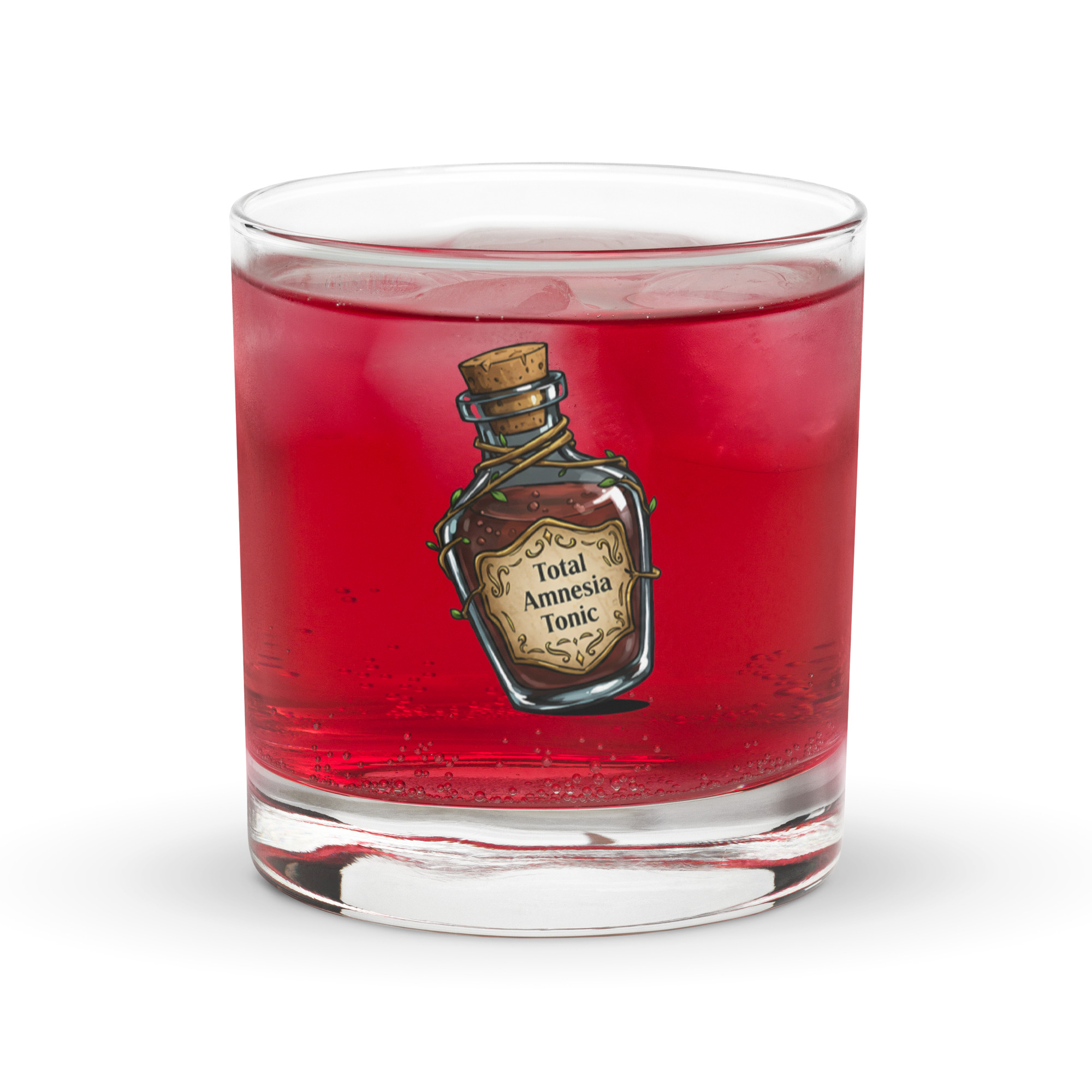 Verre cylindrique transparent contenant un liquide rouge et des glaçons. Une illustration d’une bouteille ancienne est apposée sur la face du verre avec l’inscription « Total Amnesia Tonic ». La bouteille illustrée a un bouchon en liège et des détails ornementaux. Aucune indication claire de cadre ou contexte supplémentaire visible.
